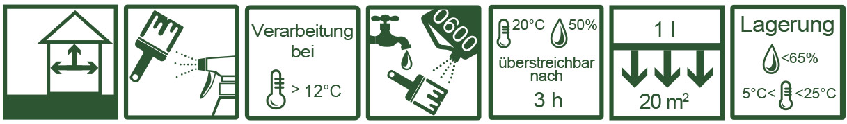 Gerbsäurehaltige Hölzer (z.B. Eiche) oder Tropenhölzer vor der Erstbehandlung mit Terpentinersatz oder Spiritus gründlich abwaschen. Untergründe müssen trocken (max. 12% Feuchte), saugfähig, schmutz- und fettfrei sein. Ein gleichmäßiger und feiner Schleifaufbau bis P240/P320 ergibt nach der Behandlung ein ausgewogenes Oberflächenbild.