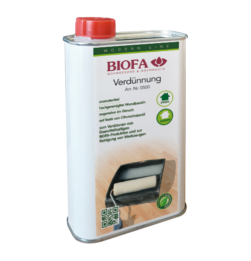 Für die Reinigung Ihrer Arbeitsgeräte empfehlen wir die BIOFA Verdünnung 0500. Sie ist ein mildes und aromatenfreies Mittel zum gründlichen und schonenden reinigen Ihres Werkzeugs. Die BIOFA Verdünnung hat einen sehr angenehmen Geruch.