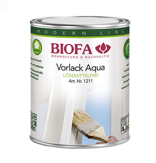 Der weiße, lösemittelfreie Vorlack AQUA 1211 wird durch eine spezielle Verkochung von natürlichen Ölen mit Wasser hergestellt. Die Unebenheiten ausgleichende, dampfdiffusionsfähige und dauer- elastische Grundierung bietet eine optimale Haftung für spätere Anstriche von Holz Oberflächen und Holzwerkstoffen mit BIOFA Öl-, Bunt- und Decklacke für innen und außen. BIOFA Produkte für den Außenbereich sollen den baulichen Holzschutz abrunden.