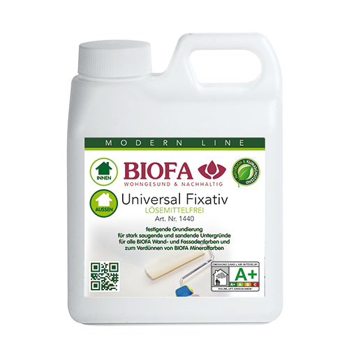 BIOFA Universal Fixativ ist ein Grundanstrich auf Basis von Kaliwasserglas für ssaugende und sandende Untergründe. Er eignet sich als Grundierung für alle BIOFA Wandfarben im Innen- und Außenbereich und als Verdünnungsmittel für BIOFA SOLIMIN Silikatfarbe, BIOFA EUROMIN Fassadenfarbe und für BIOFA SOLIMIN Quarzstreichputz.