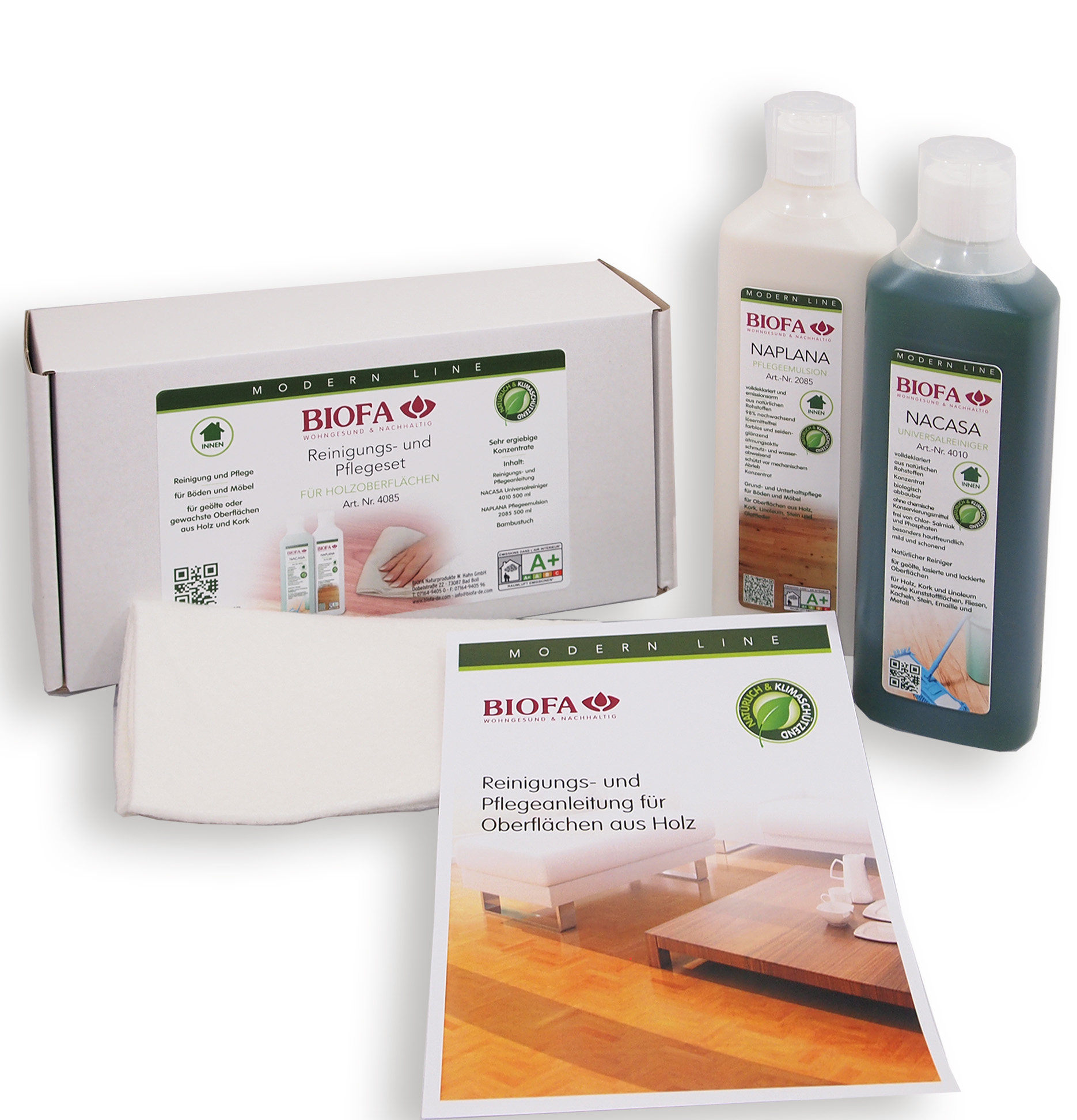 Eine sorgfältige Reinigung und Pflege z. B. durch den Einsatz des BIOFA Reinigungs- und Pflegesets sind wichtige Maßnahmen, um die Qualität und Schönheit der natürlichen Holzoberflächen dauerhaft zu erhalten, ob auf geölten oder gewachsten Holzböden, Möbeln, Küchenarbeitsplatten oder sonstigen entsprechenden Oberflächen.