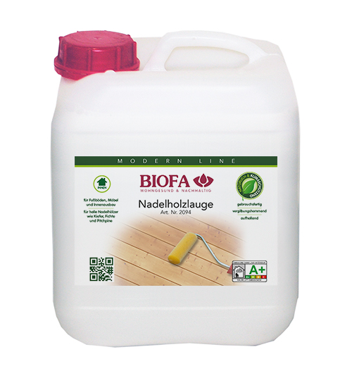 BIOFA Nadelholzlauge ist ein Produkt zum Aufhellen von geschliffenen, unbehandelten Böden, Möbeln, Wänden, Decken, Türen und Innenausbauten aus hellen Nadelhölzern wie Kiefer, Fichte, Pitchpine etc.
